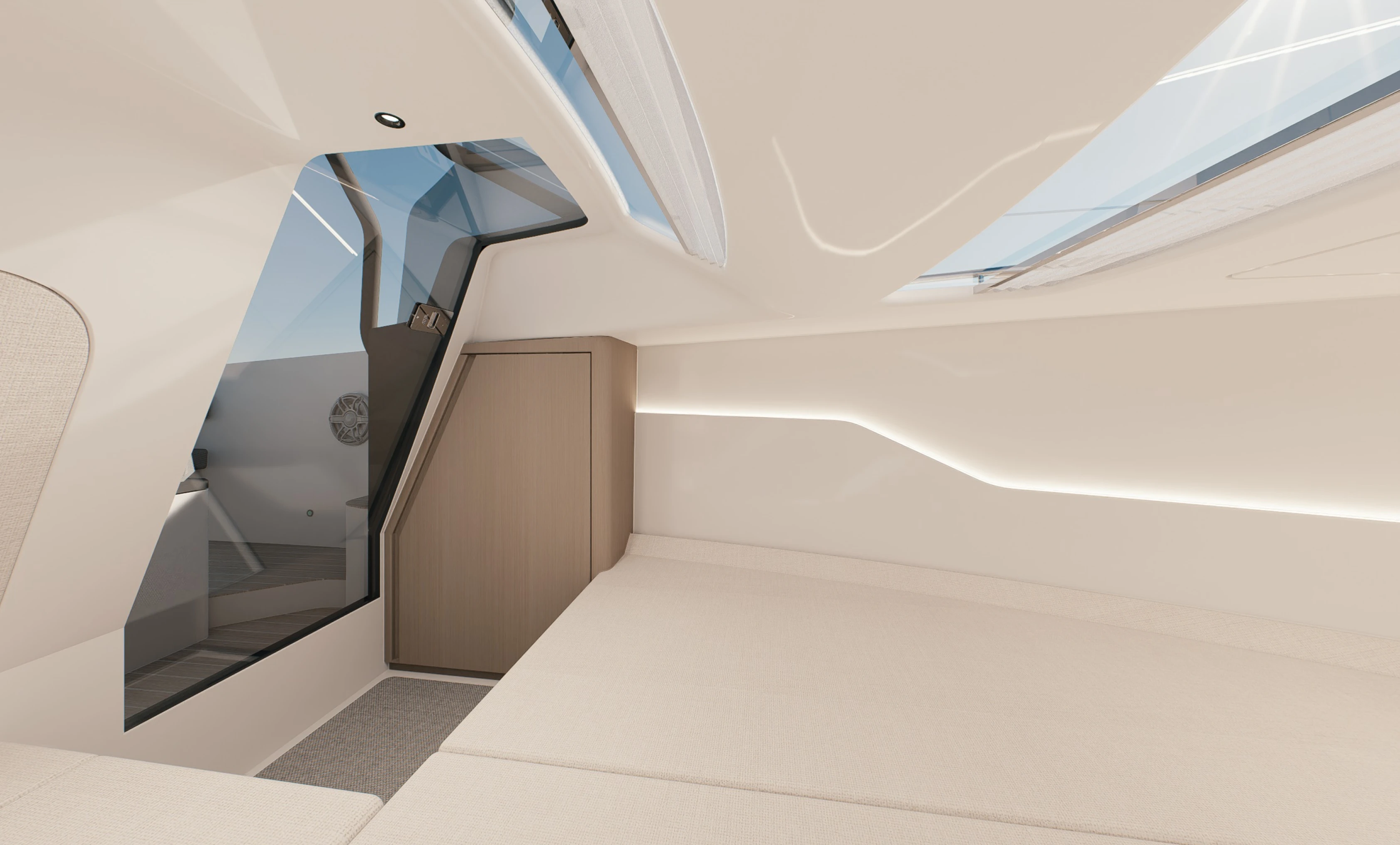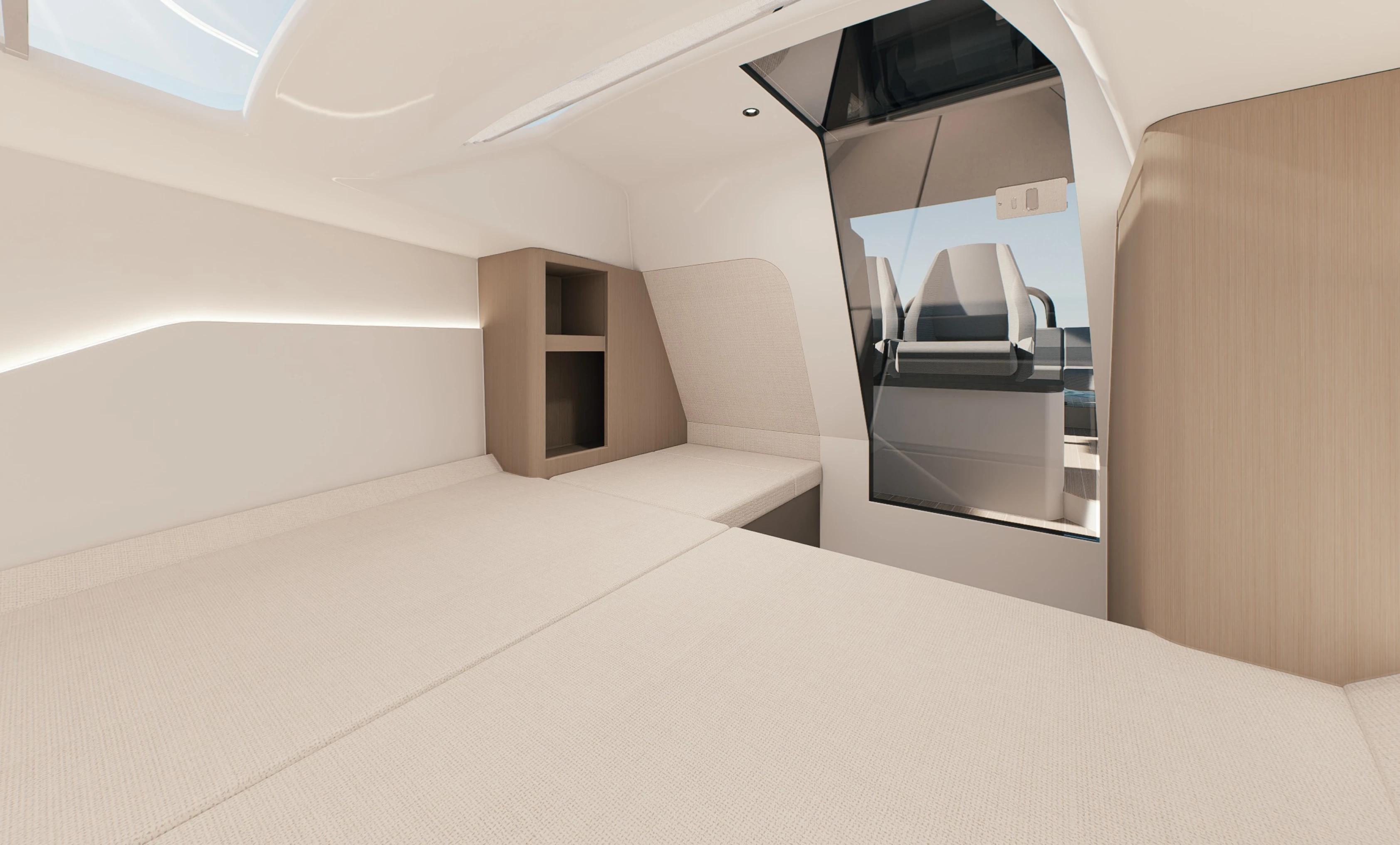 The open, semi-walkaround deck lets everyone flow bow to stern; at anchor, the drop-down terraces widen the boat and bring you right to the water. Convertible seating fore and aft